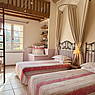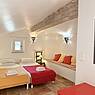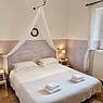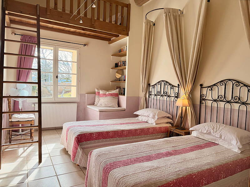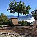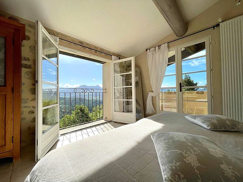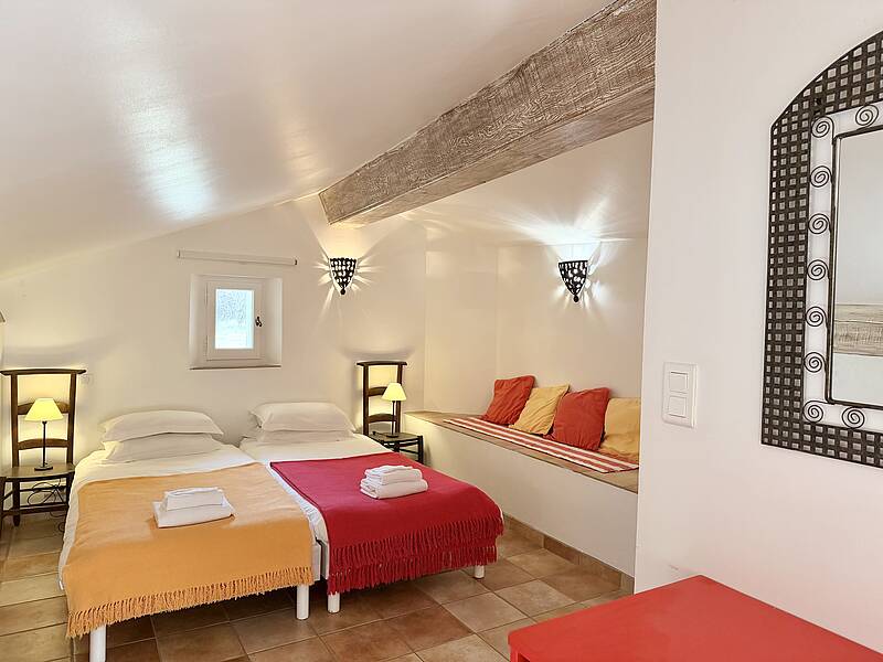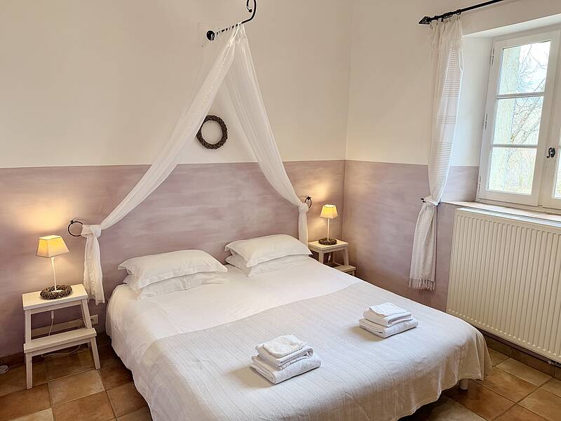 Über eine Steintreppe gelangen Sie in die erste Etage der Unterkunft. Hier befinden sich ein geräumiges Doppelzimmer (Doppelbett 160 x 200 cm sowie ein zusätzliches Schlafsofa 140 x 200 cm) und ein weiteres Badezimmer mit Badewanne, bodentiefer Dusche, Waschbecken und WC. Von hier genießen Sie einen wunderbaren Blick auf die Alpen und die umliegende Landschaft. Über eine weitere Steintreppe gelangen Sie in die zweite Etage, in der sich ein zusätzlicher, gemütlicher Schlafbereich mit zwei komfortablen Einzelbetten (je 90 x 200 cm) befindet – ruhig gelegen und ideal als privater Rückzugsort. Ein eigenes Badezimmer mit Waschbecken und WC ergänzt diese zweite Etage. Preis: ab 156 EUR/Nacht (Mindestaufenthalt in der Hochsaison (Juli/August): 7 Nächte, Mindestaufenthalt in der Nebensaison: 2-3 Nächte). Bei Belegung des Hauses mit nur 1-2 Personen gibt es einen Preisnachlass von +/- 10 % (abhängig von der Saison). Bettwäsche und Handtücher sind inklusive.